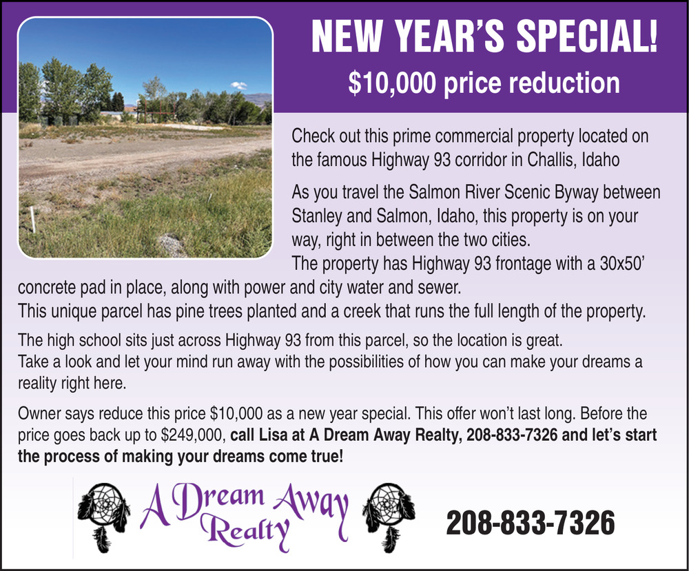 Jan 08, 2026. A Dream Away Realty Real Estate Ads from Challis Messenger