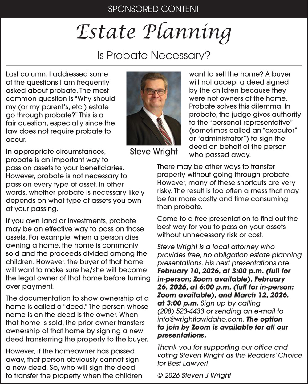 Feb 07, 2026. Wright Law Offices Attorneys Ads from Post Register