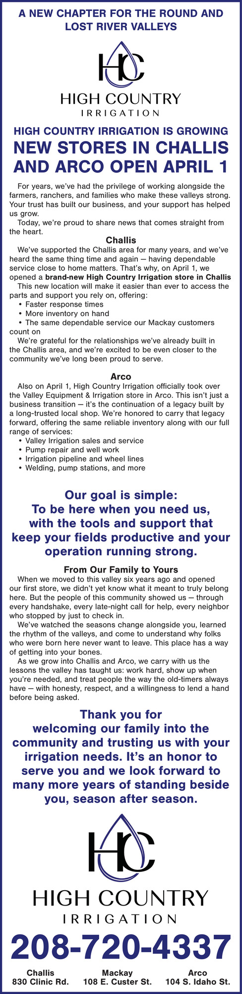 208-720-4337120 Custer StMackay, ID 83251(High Country Irrigation)
